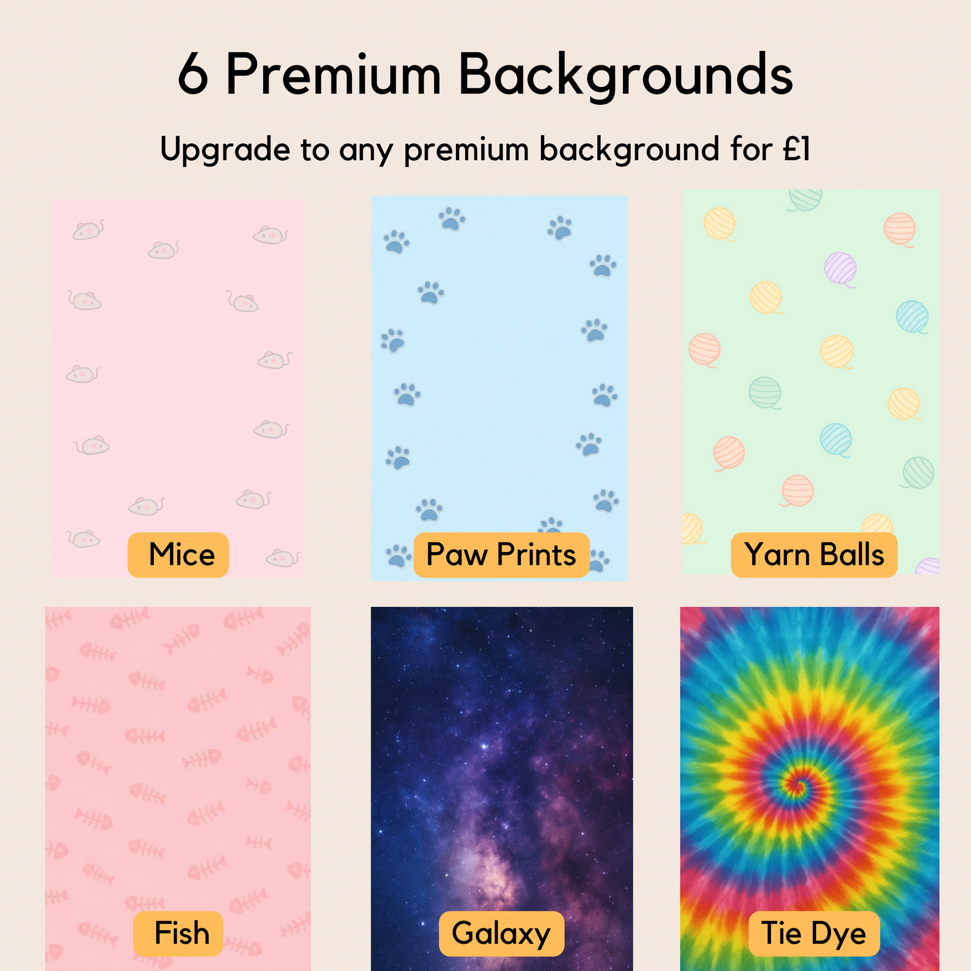 🌟 6 Premium Backgrounds (+£1) – Mice, Paw Prints, Yarn Balls, Fish, Galaxy, or Tie Dye