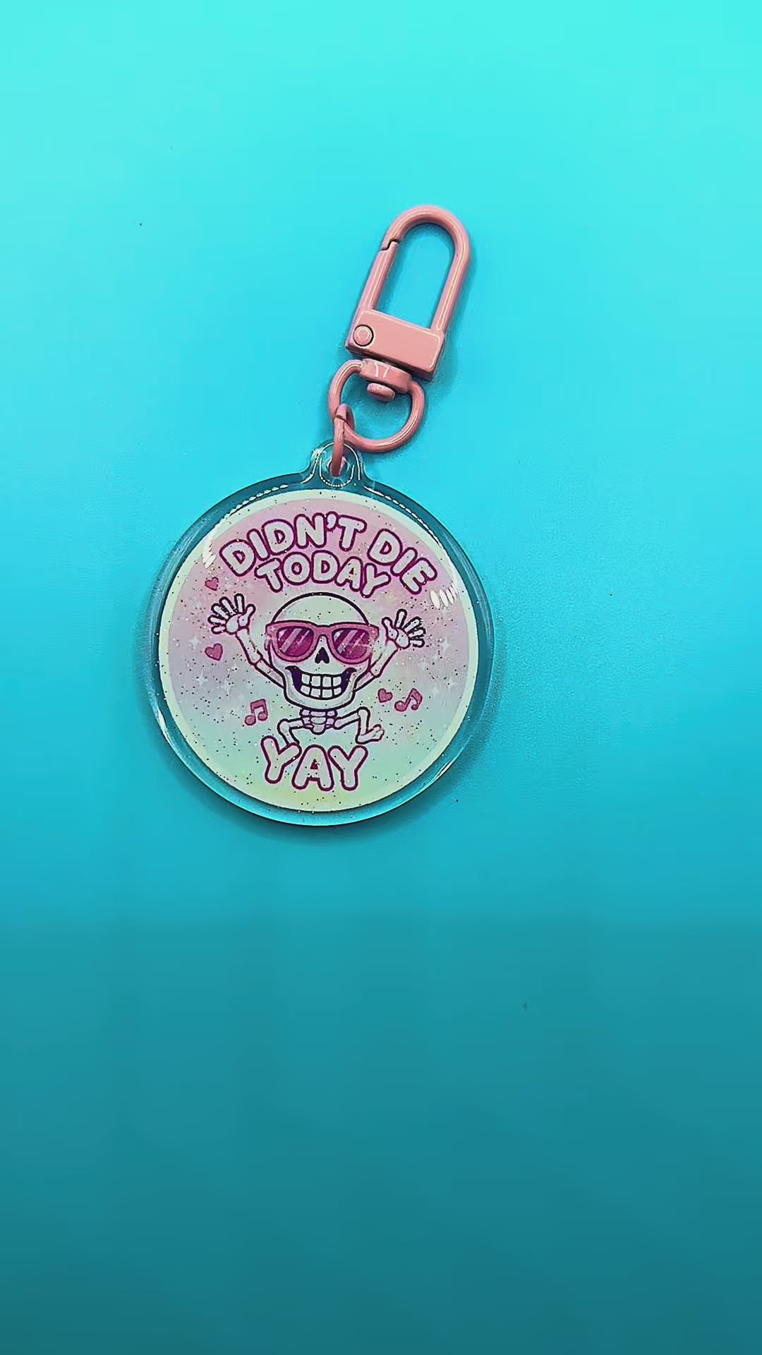 The Didn’t Die Today Yay glitter acrylic keyring is a cheeky, uplifting accessory that celebrates surviving the day — one tiny win at a time. Featuring a happy dancing skeleton and playful message, this keyring is made from high-quality acrylic with glitter embedded inside the material, giving it a smooth, durable finish with subtle sparkle — no flaking, shedding, or rough texture.